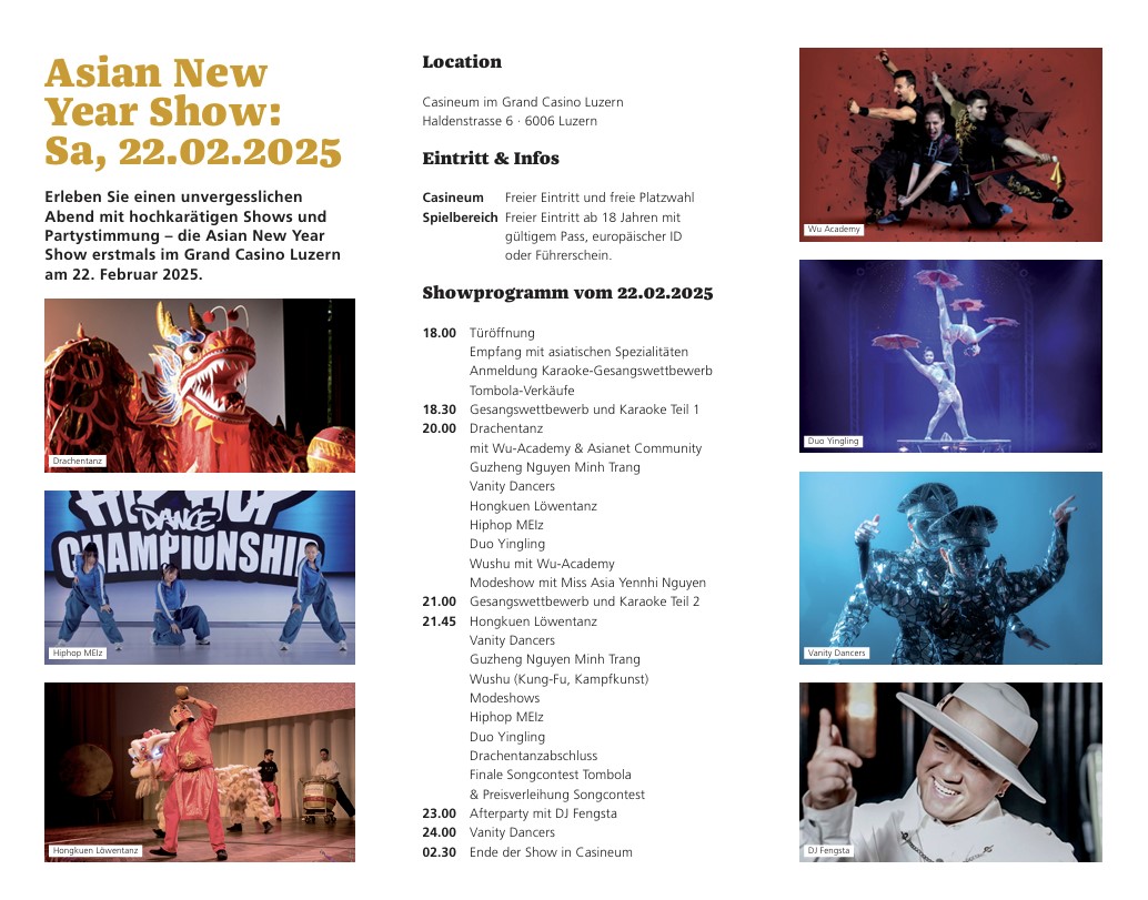 Die Asianet Community lädt Sie zu einer hochkarätigen Show ein – eine der teuersten Asiashows (Nr. 4) – und bietet mit dem Casineum im Grand Casino Luzern eine der schönsten Party-Locations der Schweiz.
